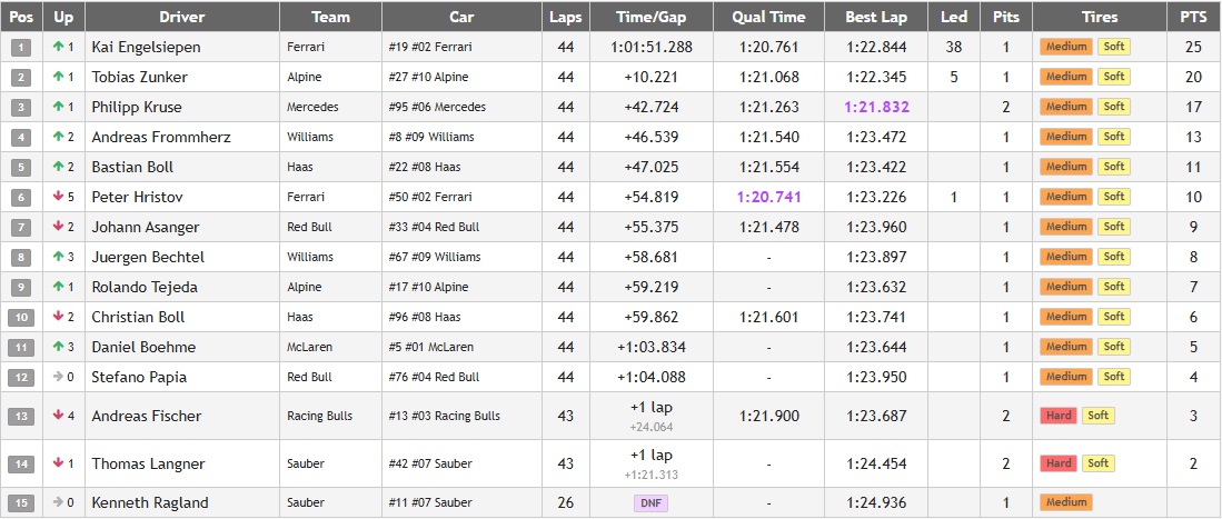 An der Spitze spielten Hristov und Engelsiepen zunächst ein erwartbares Teamspiel. Bereits in Runde 2 tauschten die Ferraris die Plätze, um Hristovs Reifen im DRS-Bereich hinter Engelsiepen zu schonen und Zunker den Zugriff auf Platz zwei zu erschweren. Doch wie schon so oft in den letzten Rennen lauerte der frischgebackene Doppelweltmeister auf kleinste Fehler. In Runde 11 nutzte Zunker eine kleine Unaufmerksamkeit Hristovs, und drückte seinen Alpine am Bulgaren vorbei auf Platz zwei. Im Titelkampf war damit ein erster wichtiger Stein verschoben, auch wenn sich Tejeda im Hinterfeld deutlich schwerer durchs Feld arbeitete als erhofft. Die vermeintlich endgültige Wende im WM-Puzzle folgte nur vier Runden später und an exakt der Stelle, an der zuvor schon Tejeda und Fischer in Probleme geraten waren: Hristov verlor seinen Ferrari in der Anfahrt, schlug in die Mauer ein und beschädigte sich den Frontflügel. Eine schier endlose Runde schleppte er den stark untersteuernden Ferrari ohne Flügel um den Kurs, ehe der Reparaturstopp ihn ans Ende des Feldes zurückwarf. Als Draufgabe zwang ihn die Strategie auf einen extrem langen Soft-Stint, der ihn zwar noch bis auf einen im Kontext beachtlichen sechsten Platz nach vorne brachte – den Traum vom Doppelsieg aber zerstörte und den Team-WM-Titel in weite Ferne rücken ließ.